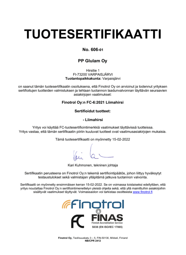 PP Glulam Oy on Varpaisjärvellä, Pohjois-Savossa sijaitseva lamellihirteen ja painumattomaan hirteen erikoistunut yritys. Vaikka yrityksemme on nuori, henkilöstöllämme on taustallaan vahva 20 vuoden ammattitaito. Varmistamme parhaan mahdollisen laadun toimituksissamme yhdistämällä tekijöidemme kokemuksen sertifioituun kotimaiseen sahatavaraan.