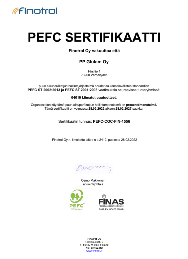 PP Glulam Oy on kotimainen hirsivalmistaja, joka keskittyy lamellihirren ja painumattoman hirren tuotantoon. Meille tärkeitä arvoja ovat laatu, luotettavuus ja tyytyväinen asiakas. Koko tuotanto tapahtuu omalla tehtaallamme – raaka-aineen valinnasta viimeistelyyn. Käytössämme on tarkka tuotantotekniikka, ja pidämme laatutason korkealla kaikissa työvaiheissa.